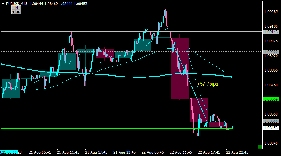 〇前日のトレード・USDJPY ドル円(15分足)昨日は前日安値を割り込んだタイミングでショート。夜までホールドしM15レベルのダウが変わったタイミングでイグジット。+61pips・EURUSD ユー