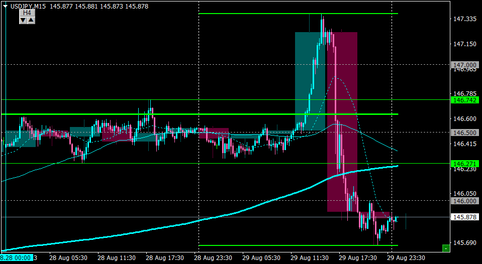 〇前日のトレード・USDJPY ドル円(15分足)昨日は前日安値を割り込んだタイミングでショート。夜までホールドしM15レベルのダウが変わったタイミングでイグジット。+61pips・EURUSD ユー
