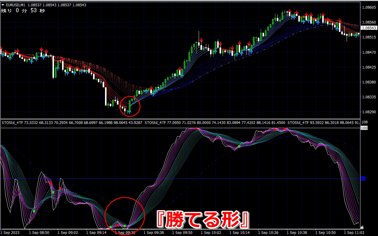 ② 矢印サイン点灯状態で、インジケーターのピンク色の帯が、緑の帯を下からすくい上げるような形状であれば、現在のローソク足が確定する数秒前か確定の直後に1分判定または3分判定でハイエントリーします。