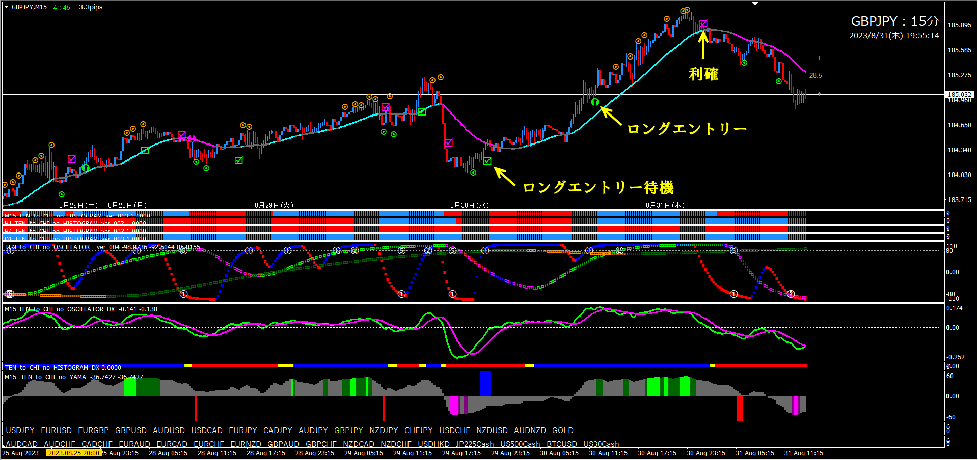 もう一つの応用テクニックとしてオシレーターTF1の色転換でロングエントリーして、ショートの点サインで自動利確、という方法も非常に効果的です。ただしロングエントリーする場所がラインから上に行き過ぎている場合は危険です。(すぐにショートの点サインが出てしまう可能性があるため)