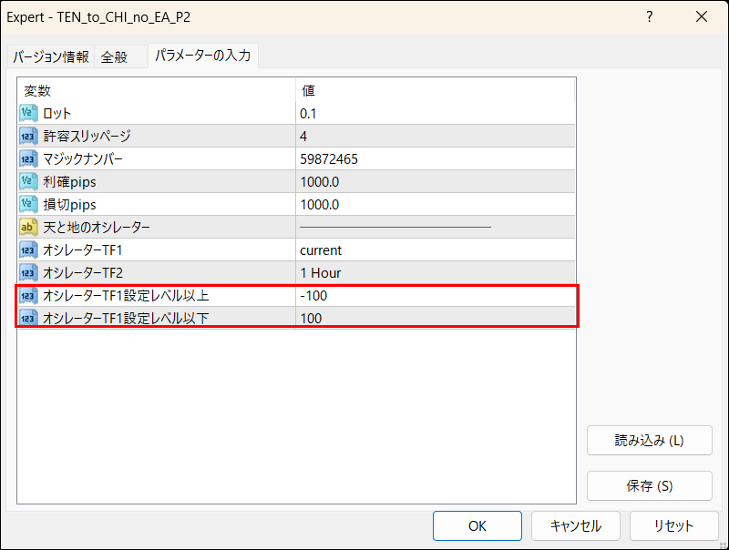 オシレーターTF2が上昇中に、EAパターン②をセットするのが良いと思います。パラメーターを画像のようにして、TF1を無効にする事でどの位置にあっても自動ロングエントリーをしてくれます。自動利確は色転換です。