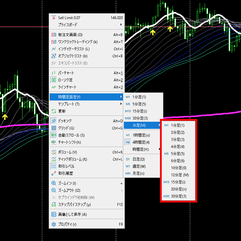 下位の時間軸も1分足・2分足・3分足と幅広い時間軸がデフォルトで用意されています。