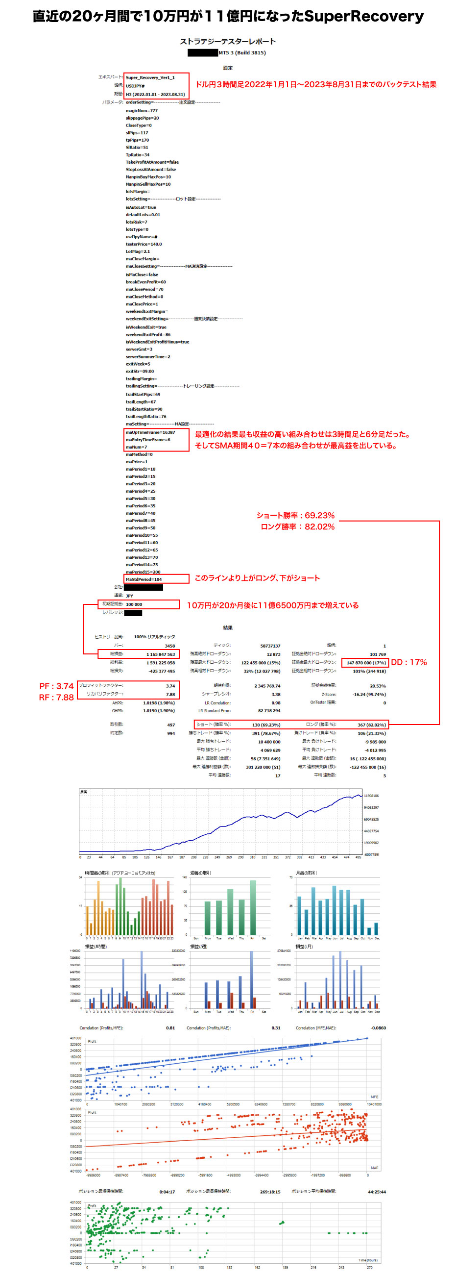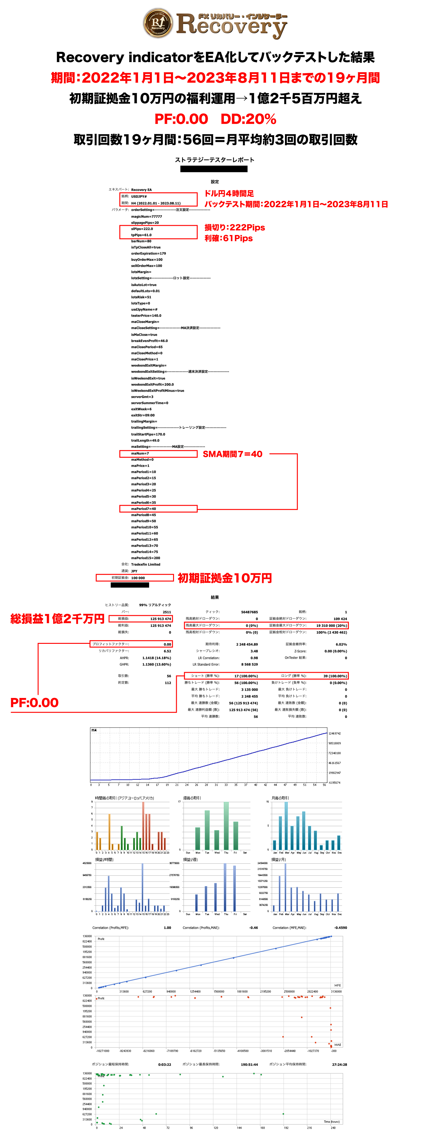 何が違うかというと『インジケーターRecovery』のサイン通りに自動売買させてEAにする事でインジケーターのサインの精度を高めているところが今までの商品と全然違うところです。