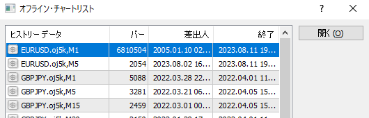 オフラインチャートリストが開くので追加した通貨ペアの1分足を選択して[開く]を押してください。