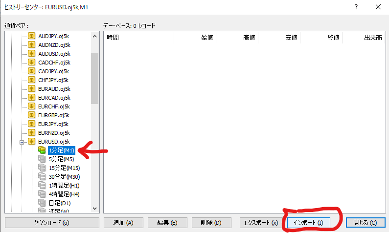 追加する通貨ペア(今回はEURUSD)の1分足を選択してインポートを押します。