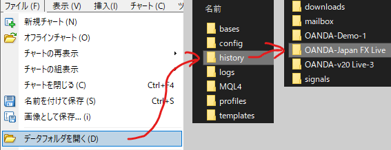 MT4上部のメニューから[ファイル -> データフォルダを開く -> historyフォルダ -> (お使いの証券会社のフォルダ)]でヒストリカルフォルダーを開いてください。