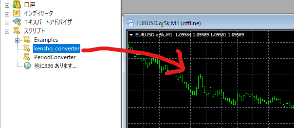 開いたオフラインチャートに「kensho_converter」を設置してください。