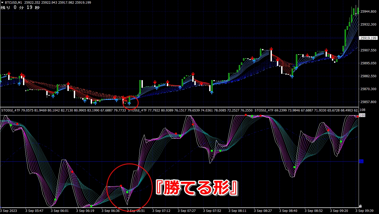 ② 矢印サイン点灯状態で、インジケーターのピンク色の帯が、緑の帯を下からすくい上げるような形状であれば、現在のローソク足が確定する数秒前か確定の直後に1分判定または3分判定でハイエントリーします。