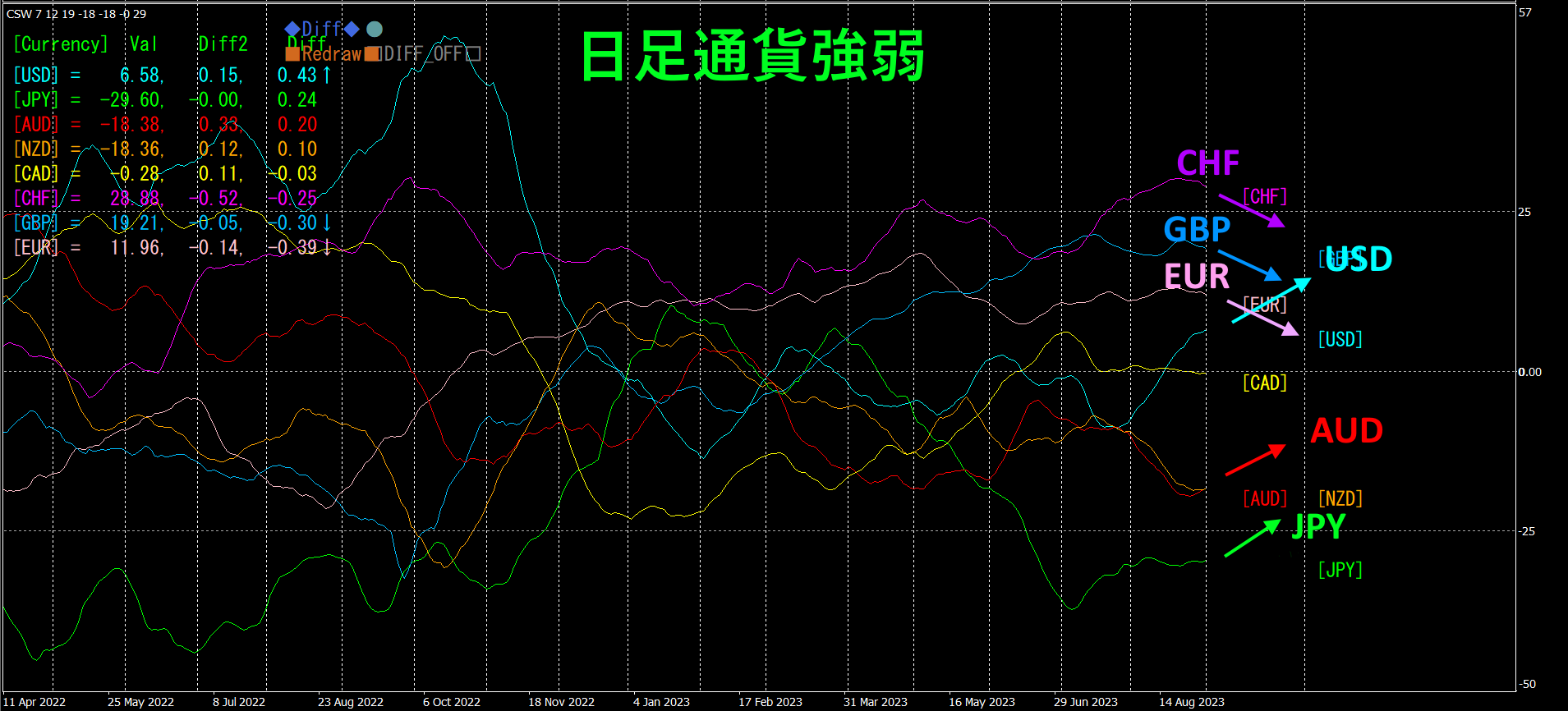 USD、JPY、AUDが上向きです。EUR、GBP、CHFは下向きです。