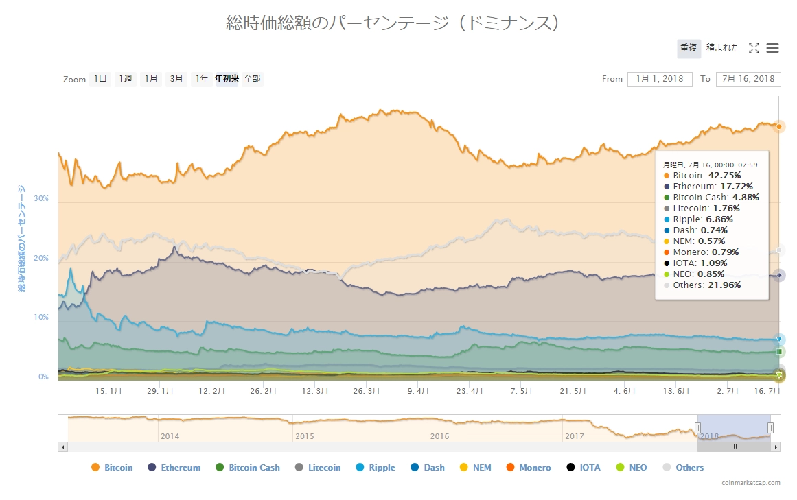 DMMビットコインのチャートを用いて、ETHJPYのチャート分析をします。テクニカルはボリンジャーバンド(20期間)、そして日足に2018年1月13日高値等を結んだ上値抵抗線、2018年3月30日安値等を結んだ下値支持線を表示。現状は、その三角もち合いを上方向へ抜け出しているものの、明確な上昇を見せられずにボリンジャーバンドがスクイーズしている段階です。ここから上を目指す際に、まずクリアすべきなのは直近高値の53,749円(7月8日)。この水準にはボリンジャーバンドの+2σもあり、ここを越えられるかが目下の関心事となります。