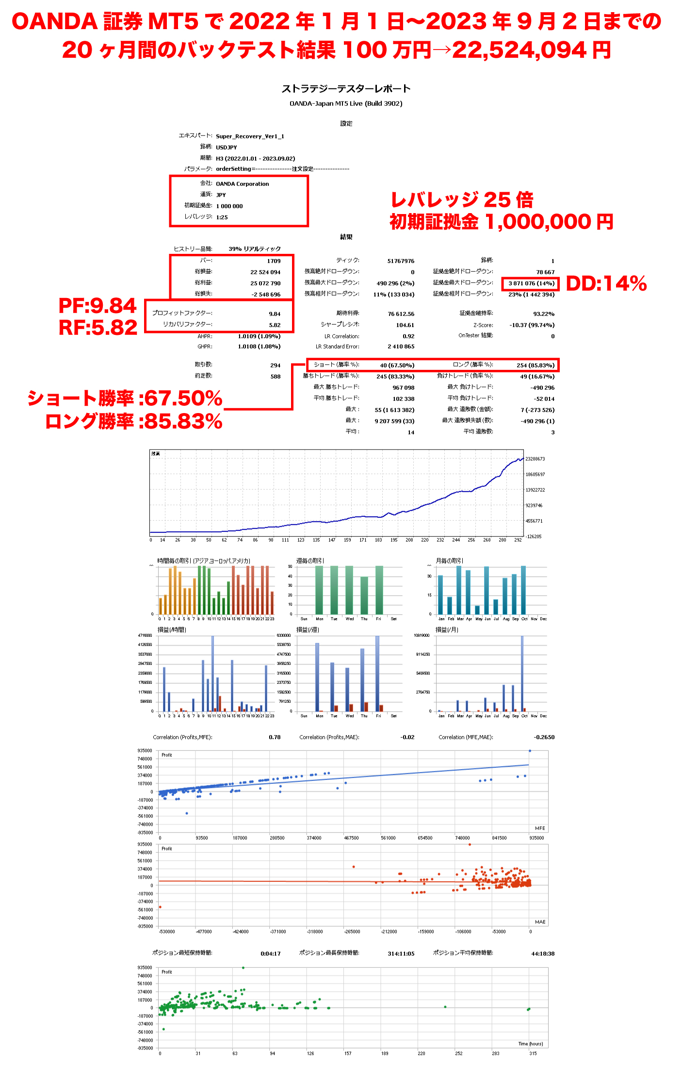 そこでOANDA証券会社のレバレッジ25倍で運用した場合のバックテスト結果をお見せします。