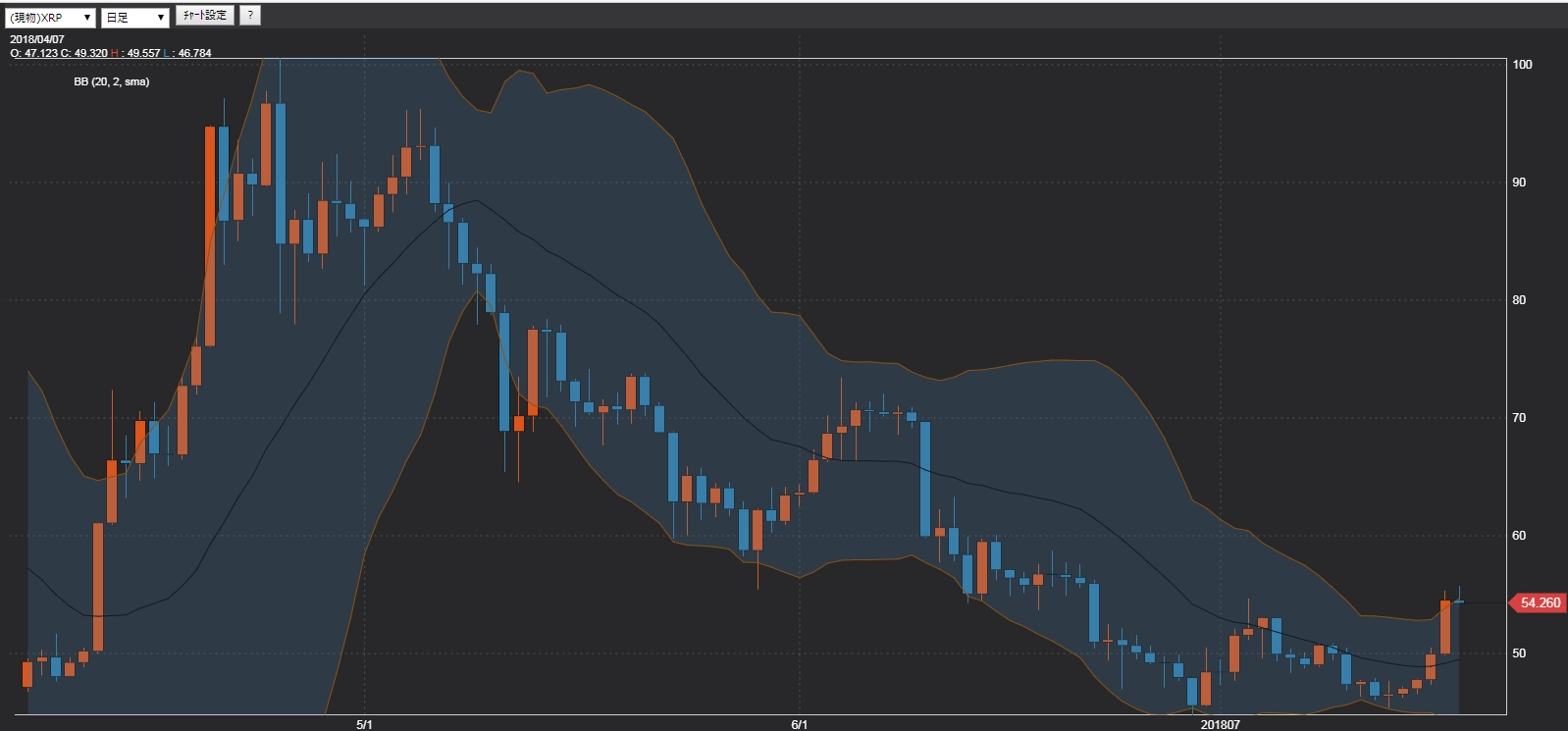 7月16日投稿の「【ETHJPY】三角もち合いから放れるか!?」では、直近高値の53,749円(7月8日)を越えられるかが目下の関心事と述べました。実際に価格はボリンジャーバンドのミドルライン→53,749円→2σラインを次々に上抜いていく流れとなりました。