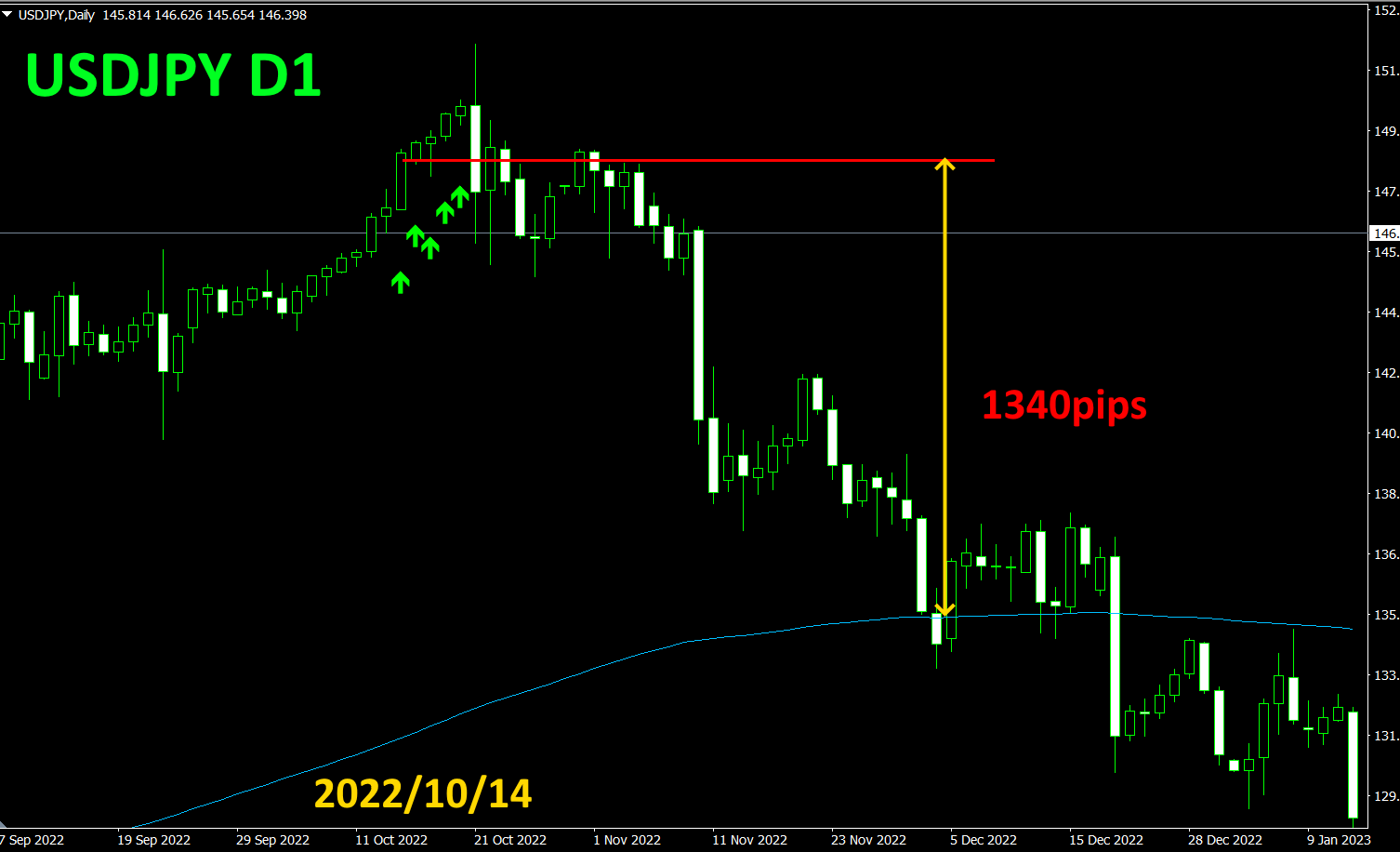 USDJPYは、2022年10月14日に「8連続陽線」が出現しました。8連続陽線出現後、次の日の始値で逆方向にエントリーします。移動平均線EMA200とローソク足がクロスするまで保有した場合、利益は1340pipsになりました。