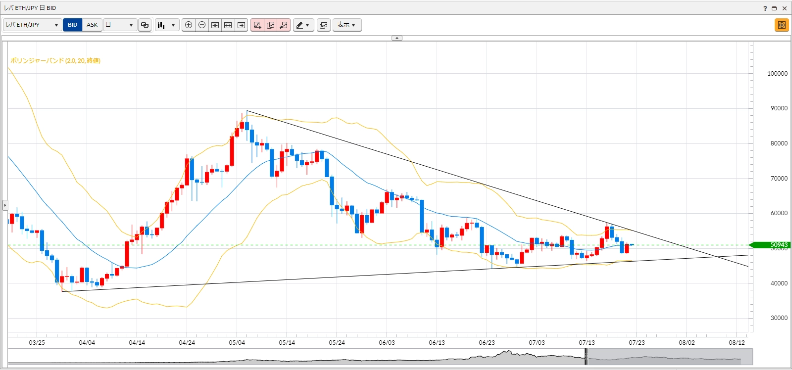 BTCJPYでデイトレする目安として、ピボットを確認します。昨日(7月21日)は陽線で終わりましたが、前日の高値および安値を切り下げる相場環境でした。