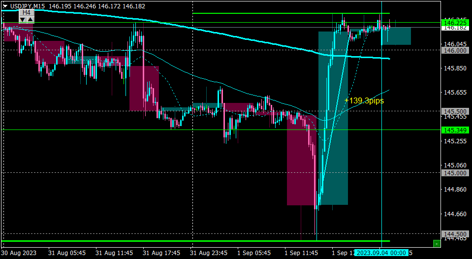 144.50という強力なサポートまで下げてきたので逆張りでロングエントリー。