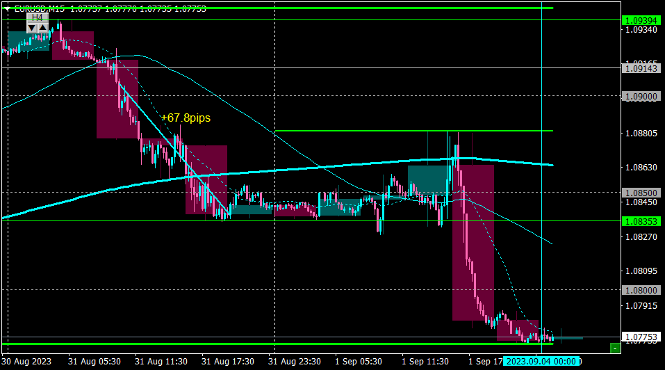 〇前日のトレード・USDJPY ドル円(15分足)昨日は先週安値141.50付近での値動きにとどまったためノートレード。・EURUSD ユーロドル(15分足)昨日は1.090付近でのプライスアクション