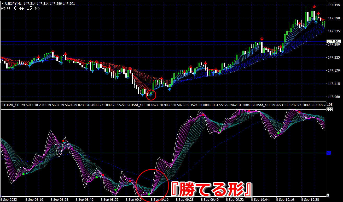★ サイン点灯後、ピンク帯が緑帯をすくい上げる形状で必勝エントリー!