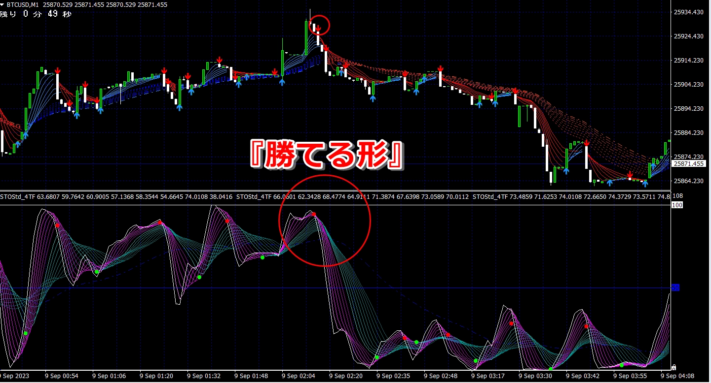 ② 矢印サイン点灯状態で、インジケーターのピンク色の帯が、緑の帯を下からすくい上げるような形状であれば、現在のローソク足が確定する数秒前か確定の直後に1分判定または3分判定でハイエントリーします。