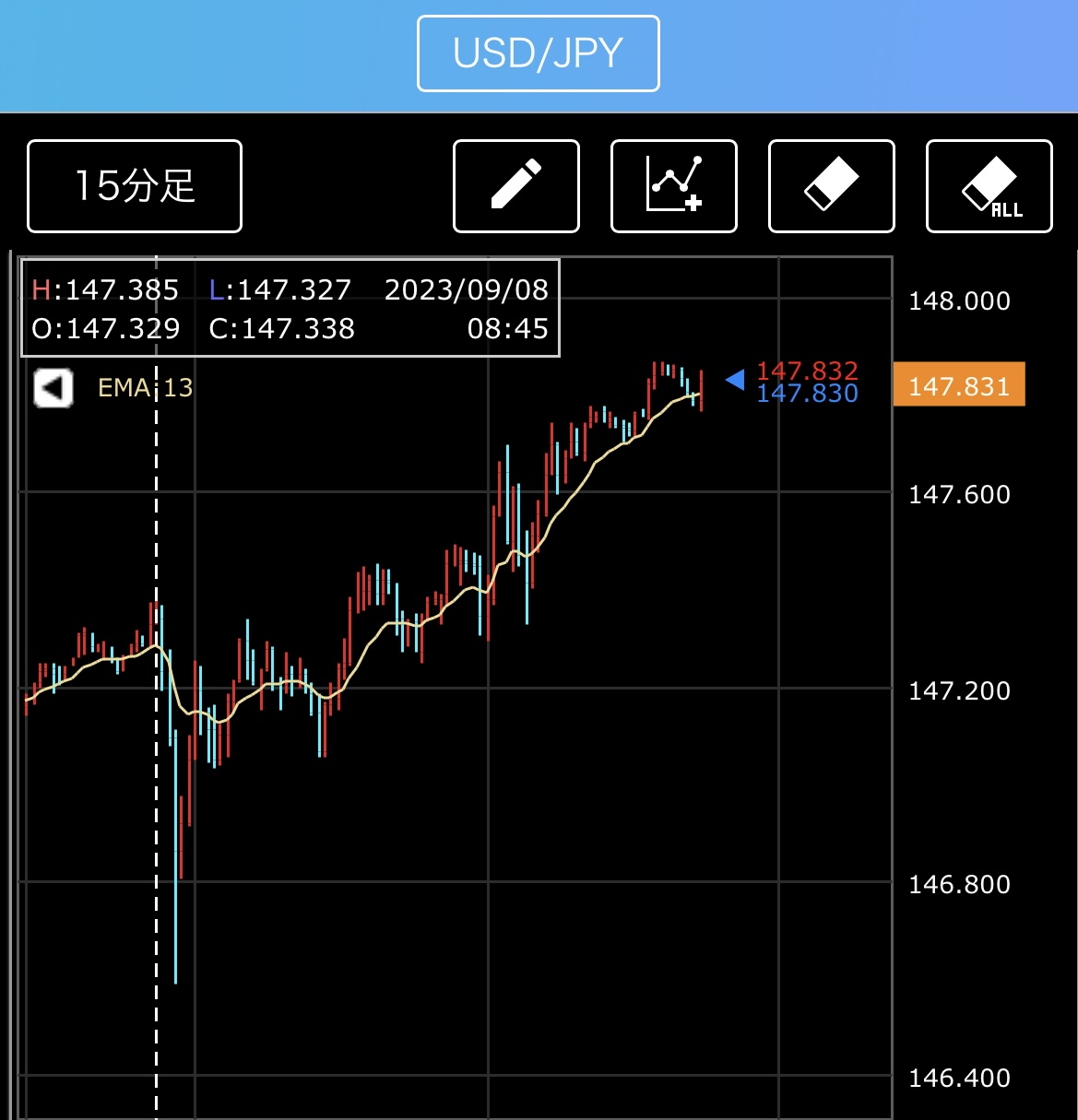 見出しに使ったチャートは、昨日のドル円15分足チャートです。