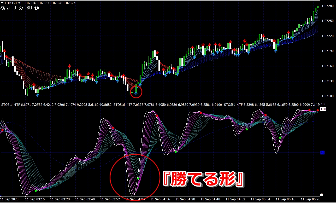 ② 矢印サイン点灯状態で、インジケーターのピンク色の帯が、緑の帯を下からすくい上げるような形状であれば、現在のローソク足が確定する数秒前か確定の直後に1分判定または3分判定でハイエントリーします。