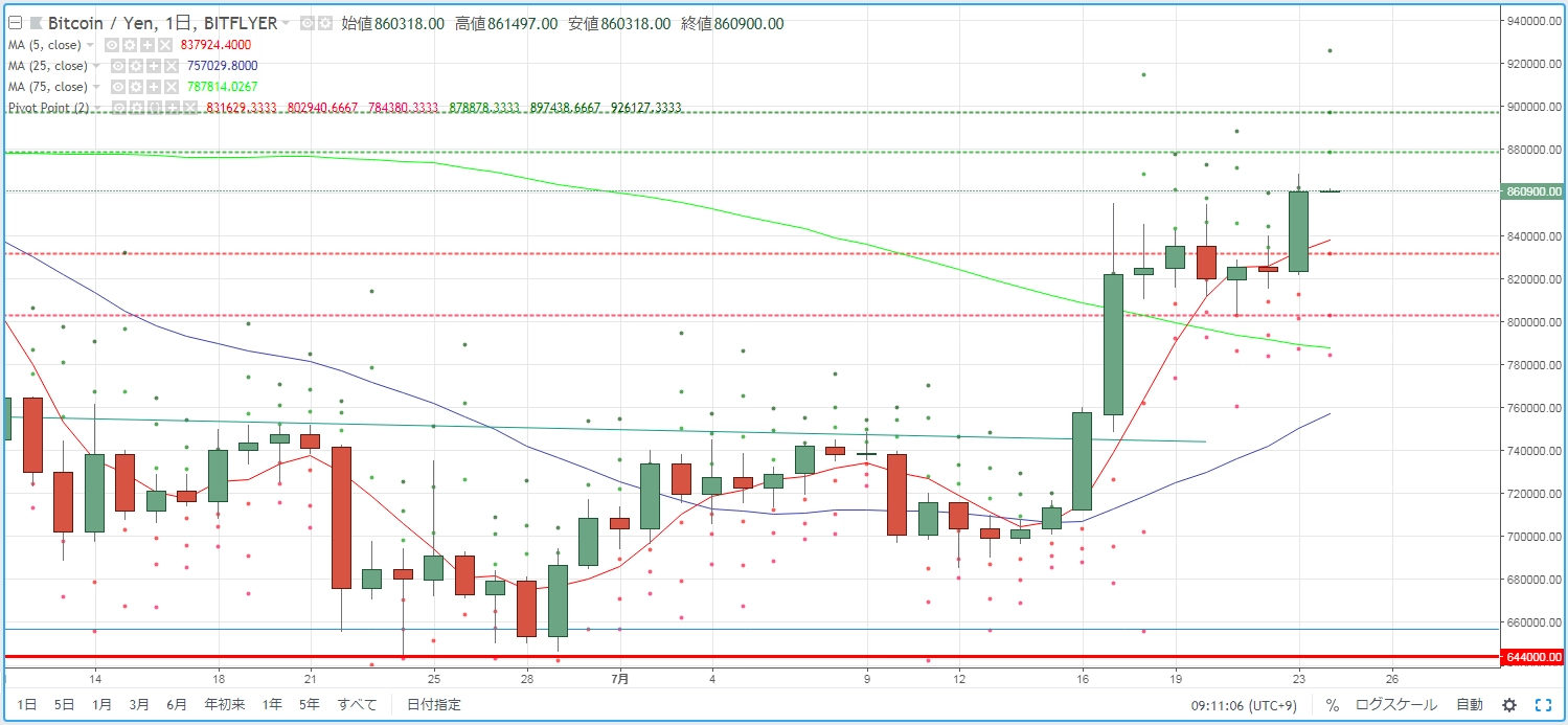 7月24日投稿の「【BTCJPY】逆三尊後の新たな展開」では、日足ベースで約85万円どころをわずかながら上抜くかたちとなり、この水準をサポートされる形になれば、いよいよ上昇への地盤固めが整いそうだと述べました。実際にはサポートを試すどころか一気に上昇し、約94万円まで続伸。週足ベースの25SMAよりも上に頭を出し、次なる目標約95万円や、100万円の大台回復を狙う格好となっています。ビットコイン保有者にとっては、久しぶりに気持ちの良い展開といえるでしょう。