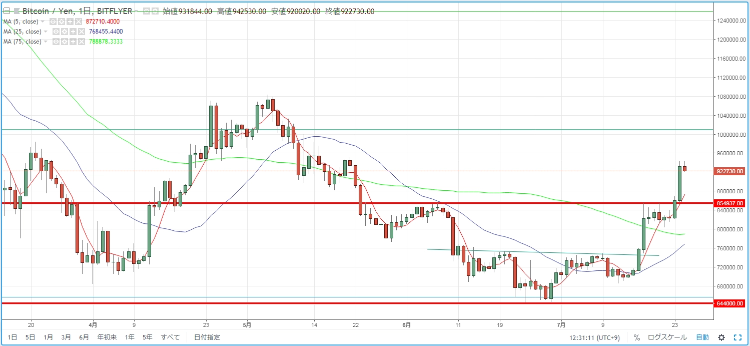 画像は2018年7月25日のキャプチャ。昨日比でビットコインが8.25%、ビットコインキャッシュが9.40%の上昇。それにつられるようにイーサリアムやライトコインも6~7%の上昇です。リップルのみ、上げ幅が大人しかったですね。以上のように全面的に上昇する相場環境でした。