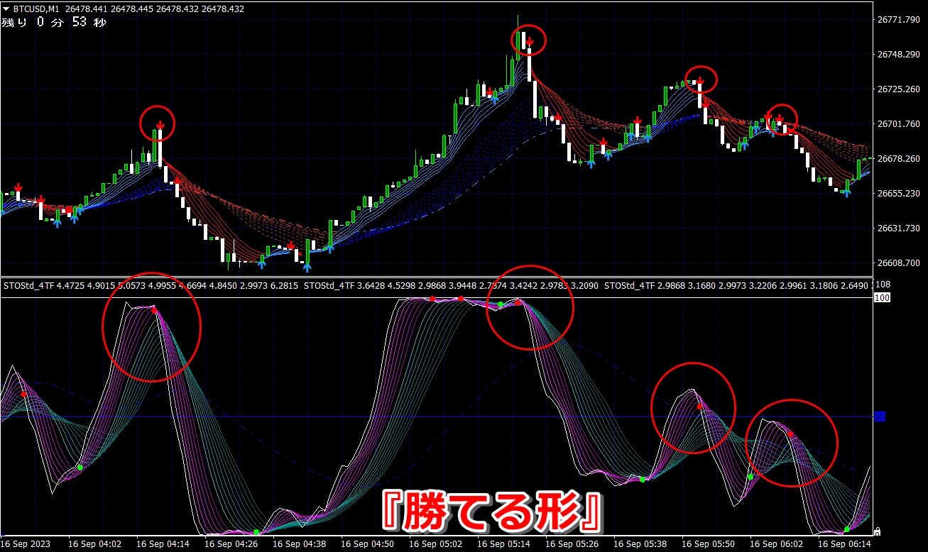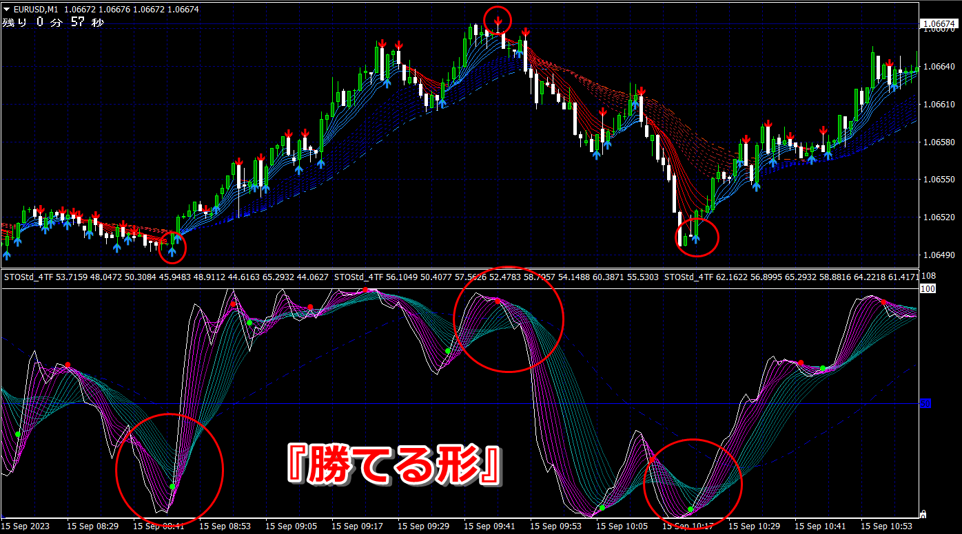 ② 矢印サイン点灯状態で、インジケーターのピンク色の帯が、緑の帯を下からすくい上げるような形状であれば、現在のローソク足が確定する数秒前か確定の直後に1分判定または3分判定でハイエントリーします。
