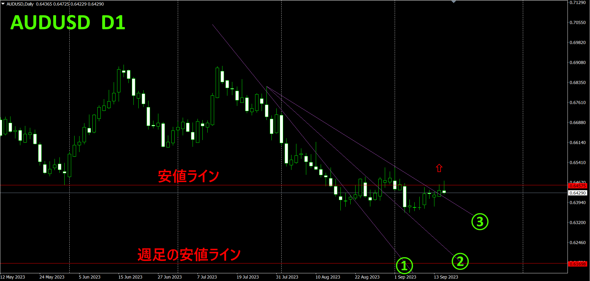 なかなか上昇してこないので、下降トレンドラインを何度も引き直しました①~③。一応、③を上抜いてきたのですが、次足のローソク足の上髭が長いので、まだ上昇の力が弱いようです。