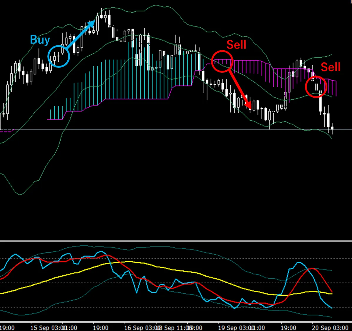 まず最初の上昇トレンドサインです。こちらは先週の値動きにはなりますが、トレンドサインに合わせてトレードができるかと思います。ただし、オシレーターがすでに「高い」形状を示していたため、警戒感を高めながらの取引になりました。