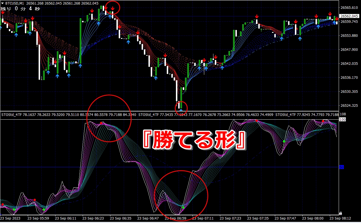 ② 矢印サイン点灯状態で、インジケーターのピンク色の帯が、緑の帯を下からすくい上げるような形状であれば、現在のローソク足が確定する数秒前か確定の直後に1分判定または3分判定でハイエントリーします。