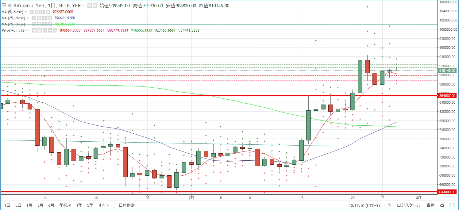 日足チャートに5月6日高値と7月17日高値を結んだ上値抵抗線を新たに引き、3月30日安値等を結んだ下値支持線にはさまれた三角もち合いが継続しています。ここ数日では値動きを小幅にし、来るブレイクへ力をため込んでいるようにも見えます。依然20SMAとからみ、この水準をもみ合いの中心としている展開。前回も述べたとおり、三角もち合いの上下どちらにブレイクするか、ブレイクするとしたら一本のローソク足で抜けるのか/じわじわと抜けるのか、その動きが最大の関心事となります。