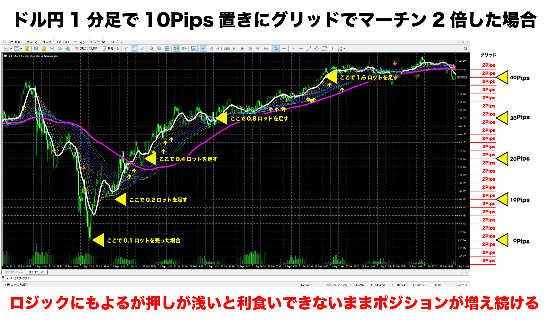 動画でも出て来ますが、一気に資金を増やすにはグリッドが破綻しやすい極端なトレンドでトレンドフォローしながらポジションを足していくピラミッティング手法というわけです。
