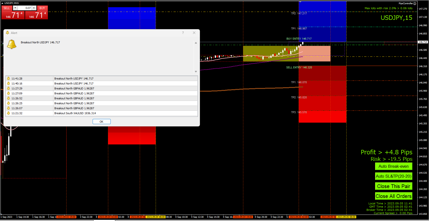 エントリー(買い/売り)のシグナルが発生すると自動的にアラートが表示されます。