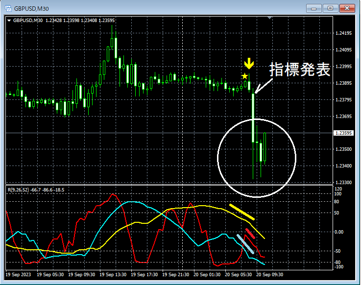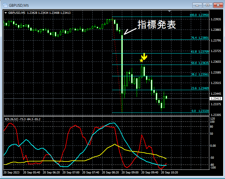 先週(2023年9月20日)のポンドドルの場合を例にとり、指標発表後の急落時における戻り売りについて少し書いてみようと思います。