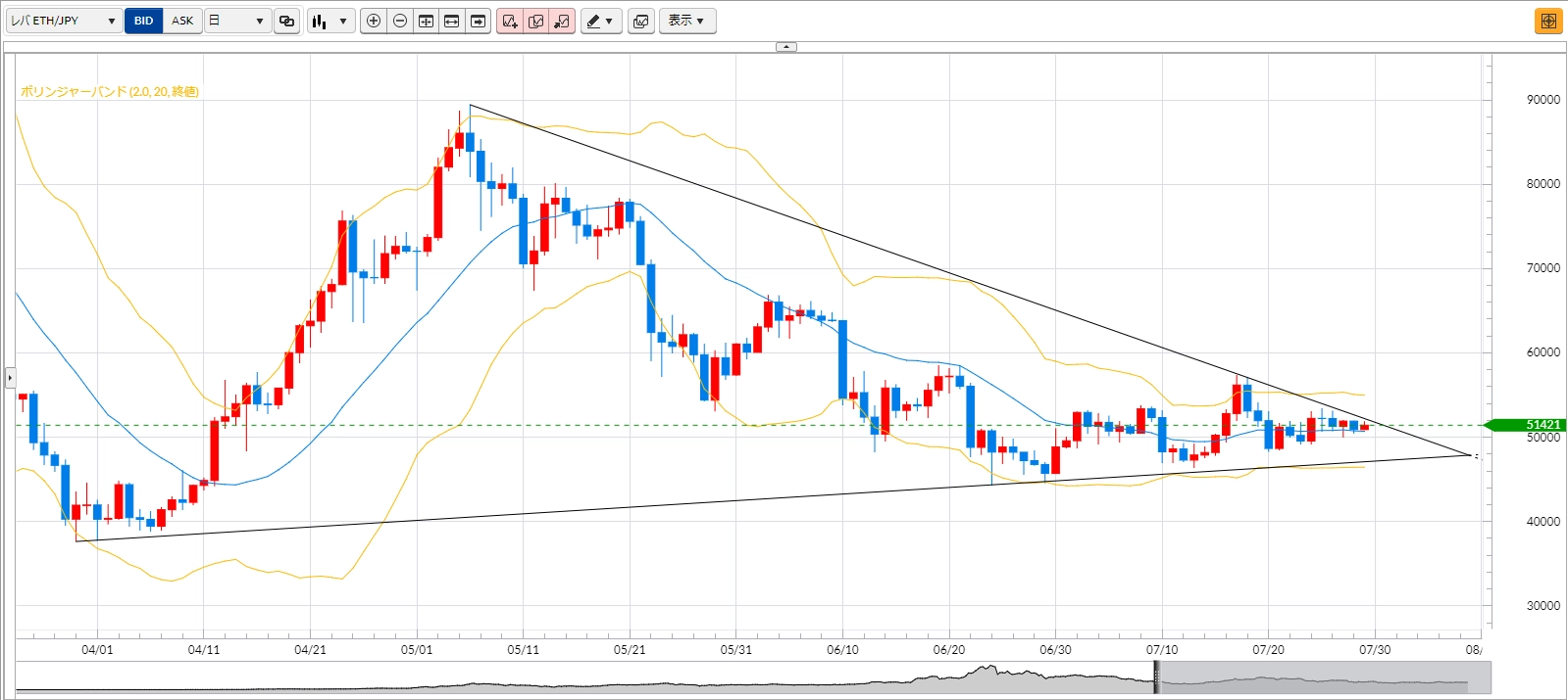 7月28日投稿の「【BTCJPY】4時間足ベースのもみ合いをどう読むか?」では、4時間足で約90万円を中心とし、上下に約5万円の幅があるもみ合いを、どう抜けていくかに注目したいと述べました。実際の値動きとしては、大きく変動することはなく、力をため込んでいる状態といったところ。本日は直近高値の約93万円を超えられるか、高値を切り下げていくのか、といった点に注目したいと思います。