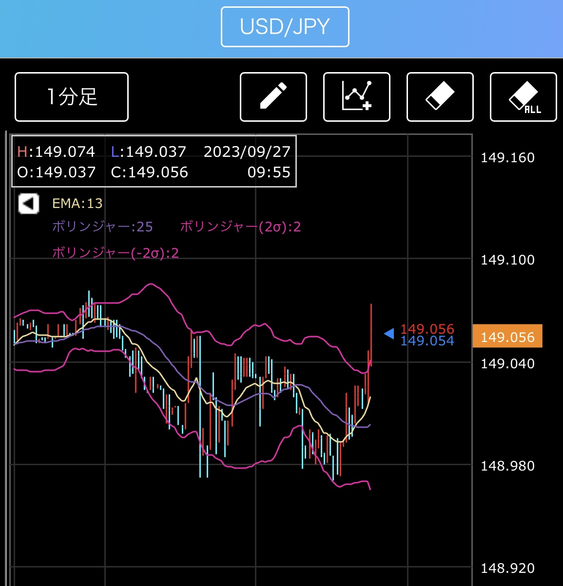 上記1分足チャートを掲載したのは、億トレーダーのスキャルピングユーザーの皆様がドル円億トレ1分足チャートを監視していて、価格が億トレ指標ゾーンを飛び越えてローソクが行ったり来たりしているのに気が付いているのかな?