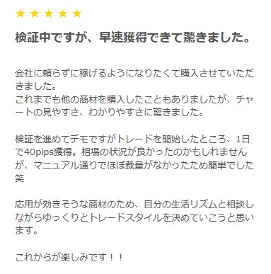 高い評価いただきありがとうございます。 1日40pips獲得という素晴らしい結果報告をいただき嬉しく思います。 これからもっと慣れてくればさらに素晴らしい成果を上げられると思います。 今後とも全力でサポート対応していきますので今後ともよろしくお願いいたします。