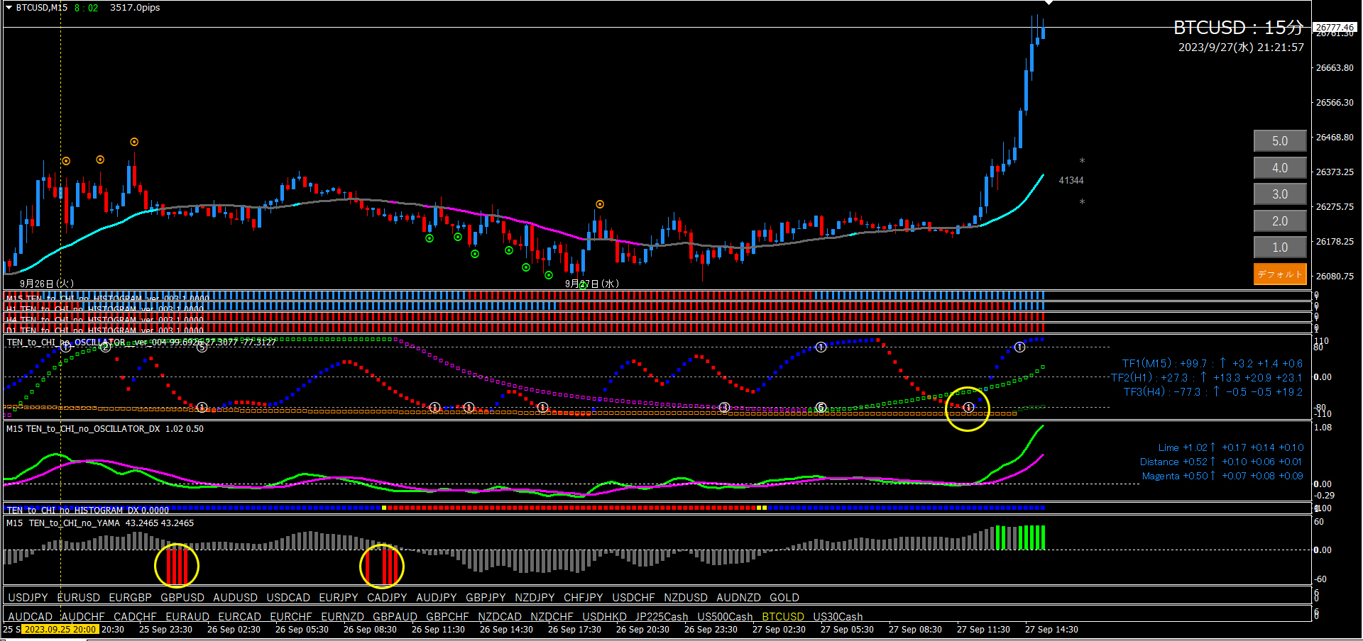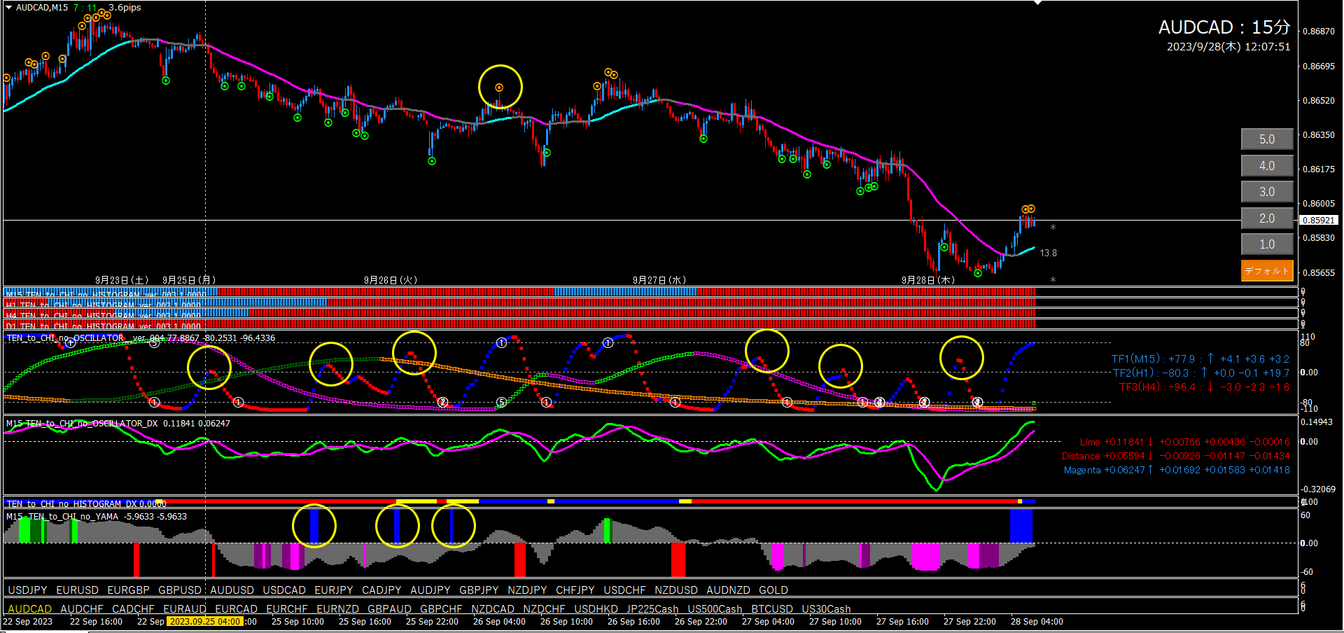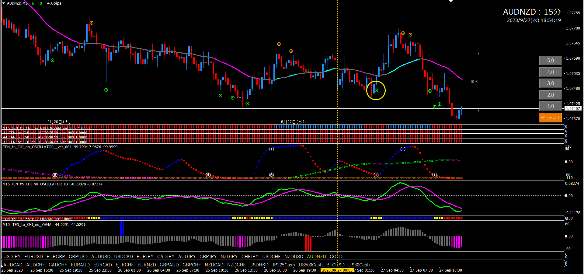 黄〇部分は、オシレーターTF2と合致しているエントリーポイントです。点、TF1、谷、この3つがトリガーとなります。4時間足の考察通り、しっかり下降してくれたので、15分足にエントリーポイントが多く出ています。点レベルを1.0にすると更にエントリーポイントが増えます。利確は全て逆の点サイン。10エントリー全てプラスだと思います。
