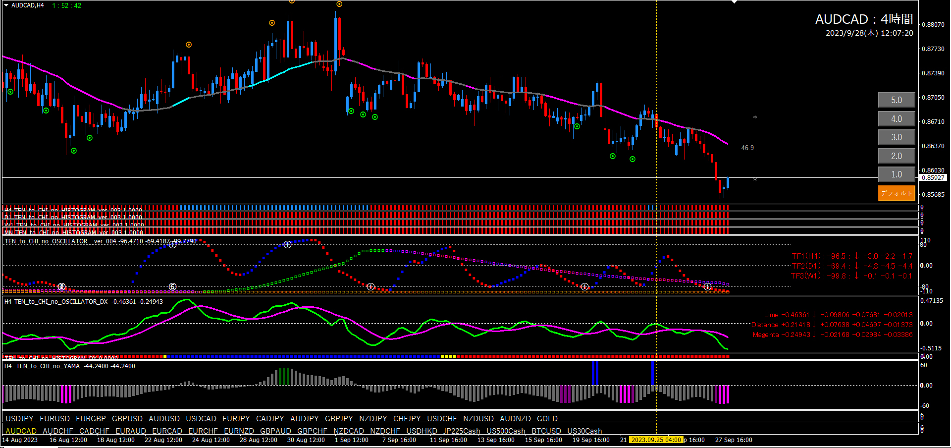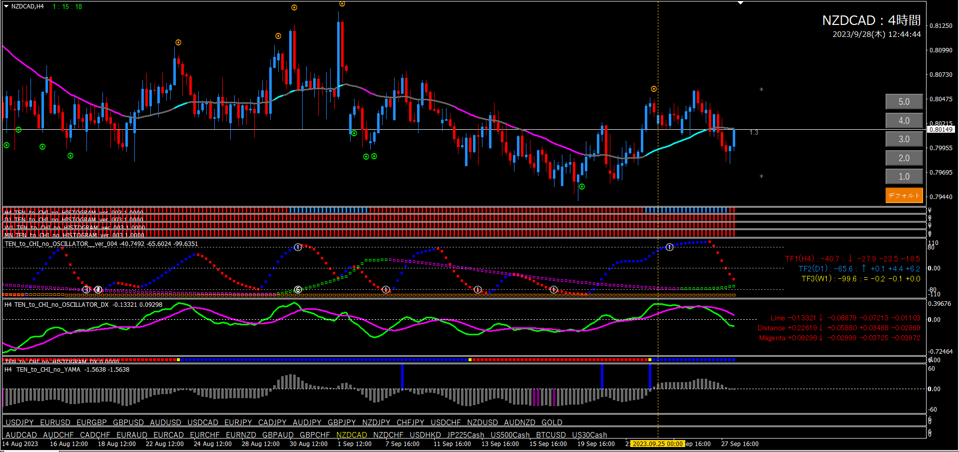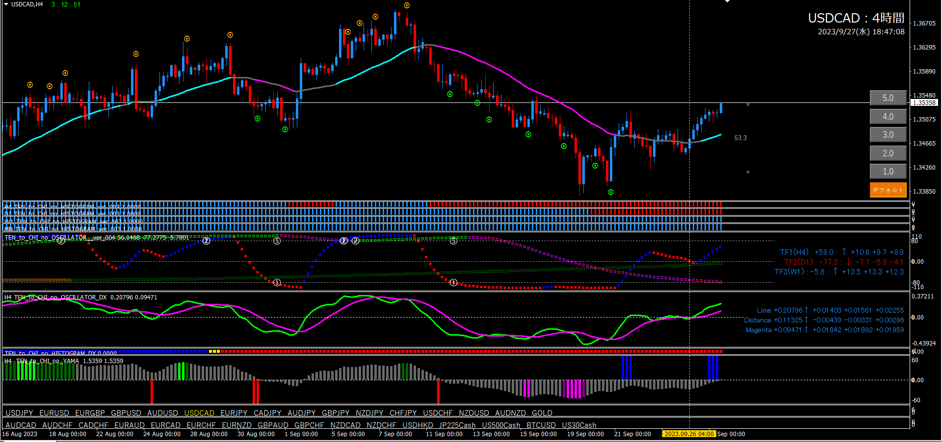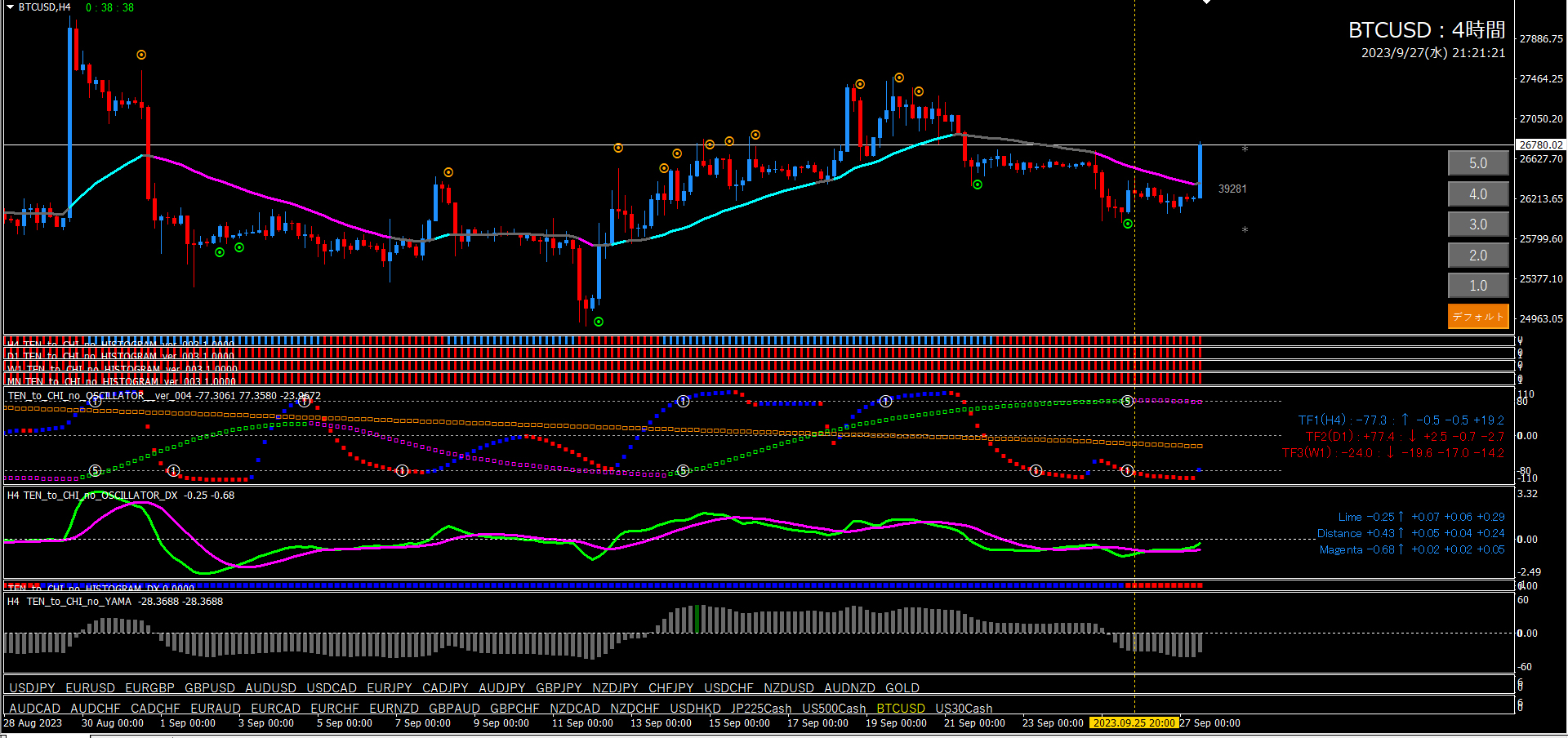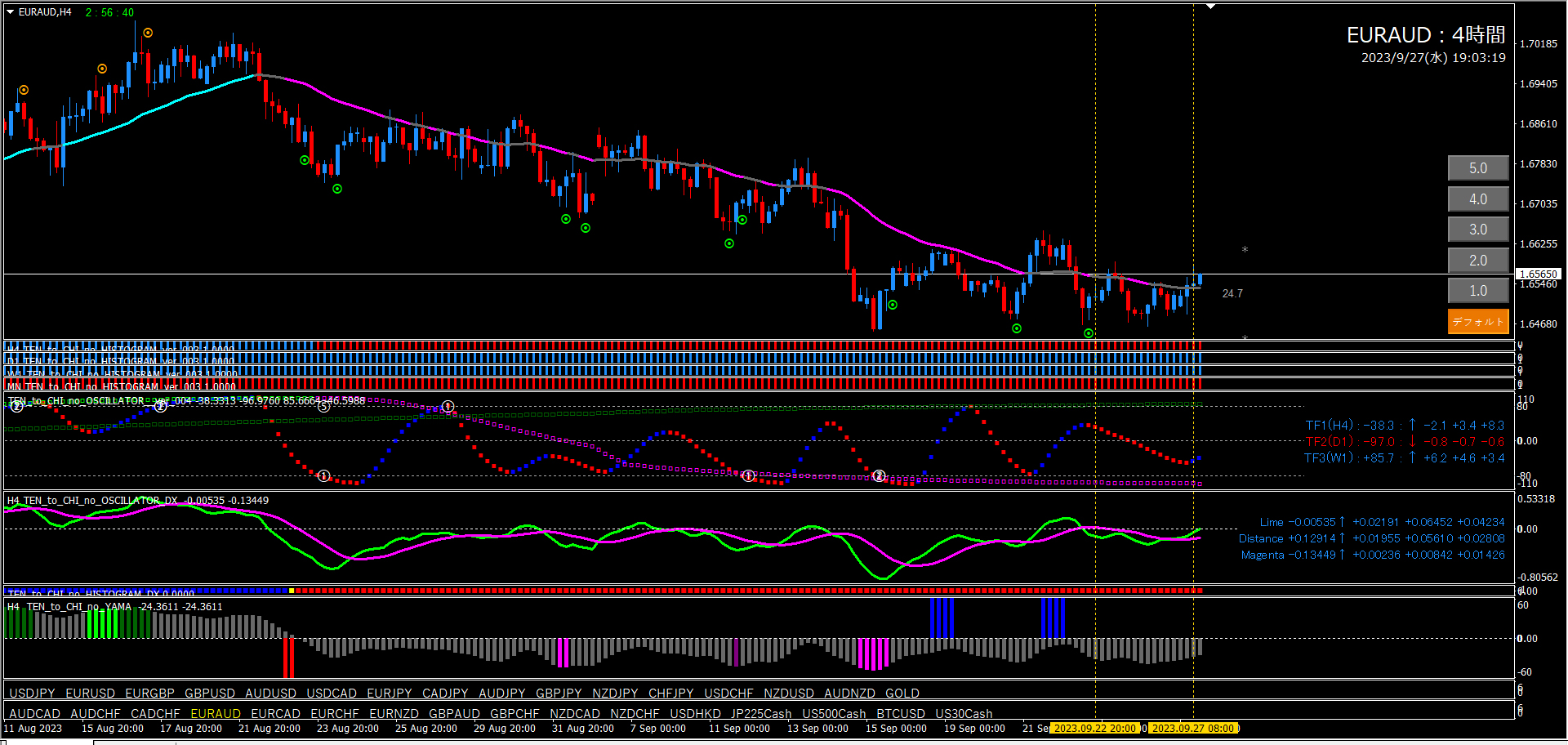これは15分足エントリーのフィルターであるオシレーターTF2が大きく関係しています。15分足のオシレーターTF2は1時間足で形成されています。15分足、1時間、4時間、この関係性が非常に重要です。天と地のインジケーターの肝でもあります。