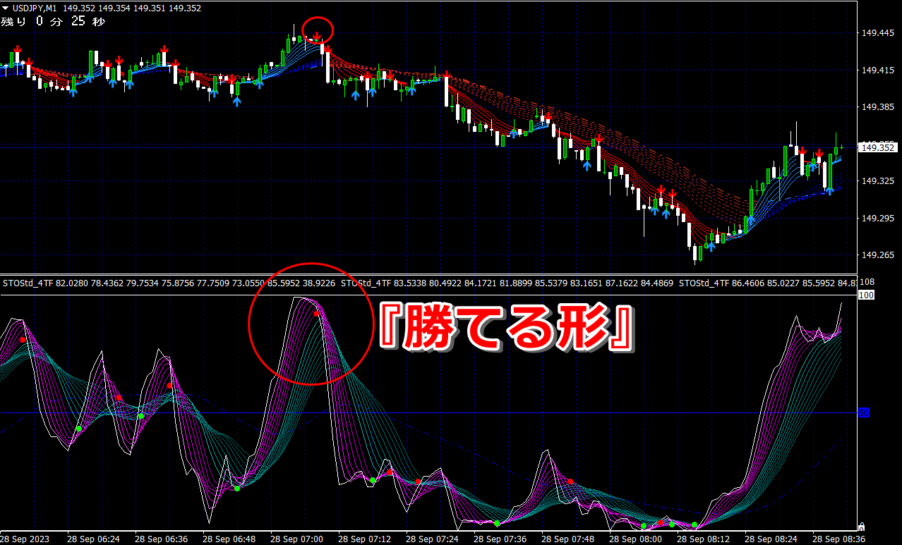 ② 矢印サイン点灯状態で、インジケーターのピンク色の帯が、緑の帯を下からすくい上げるような形状であれば、現在のローソク足が確定する数秒前か確定の直後に1分判定または3分判定でハイエントリーします。