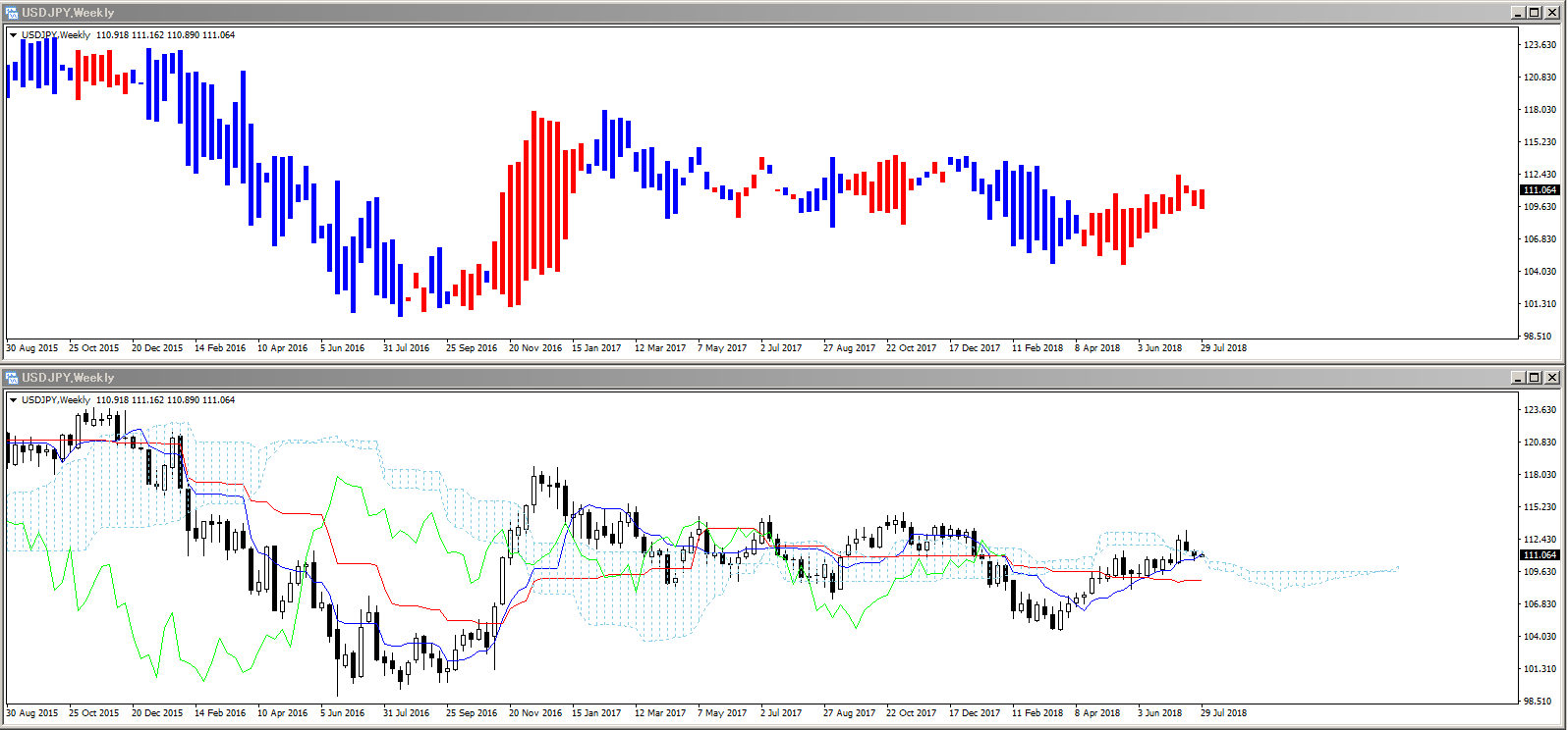 <2018年7月30日週・ドル円(上段:九週足、下段:週足)>