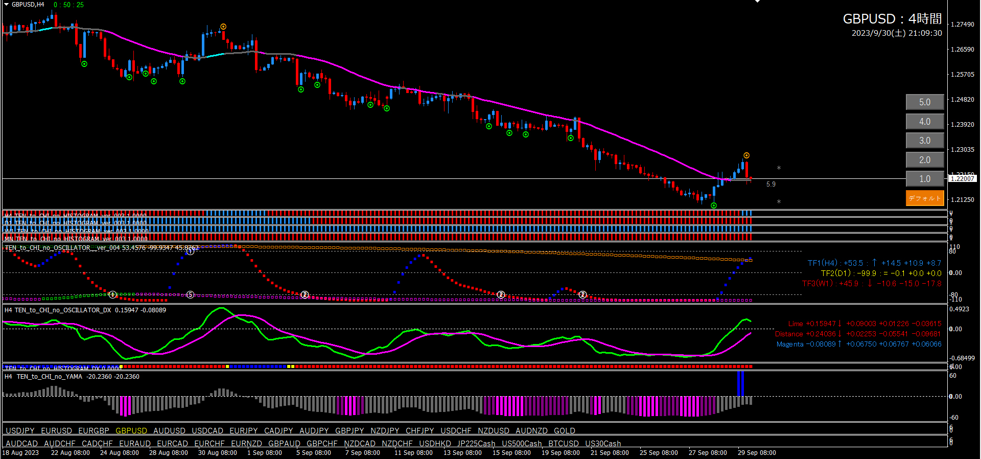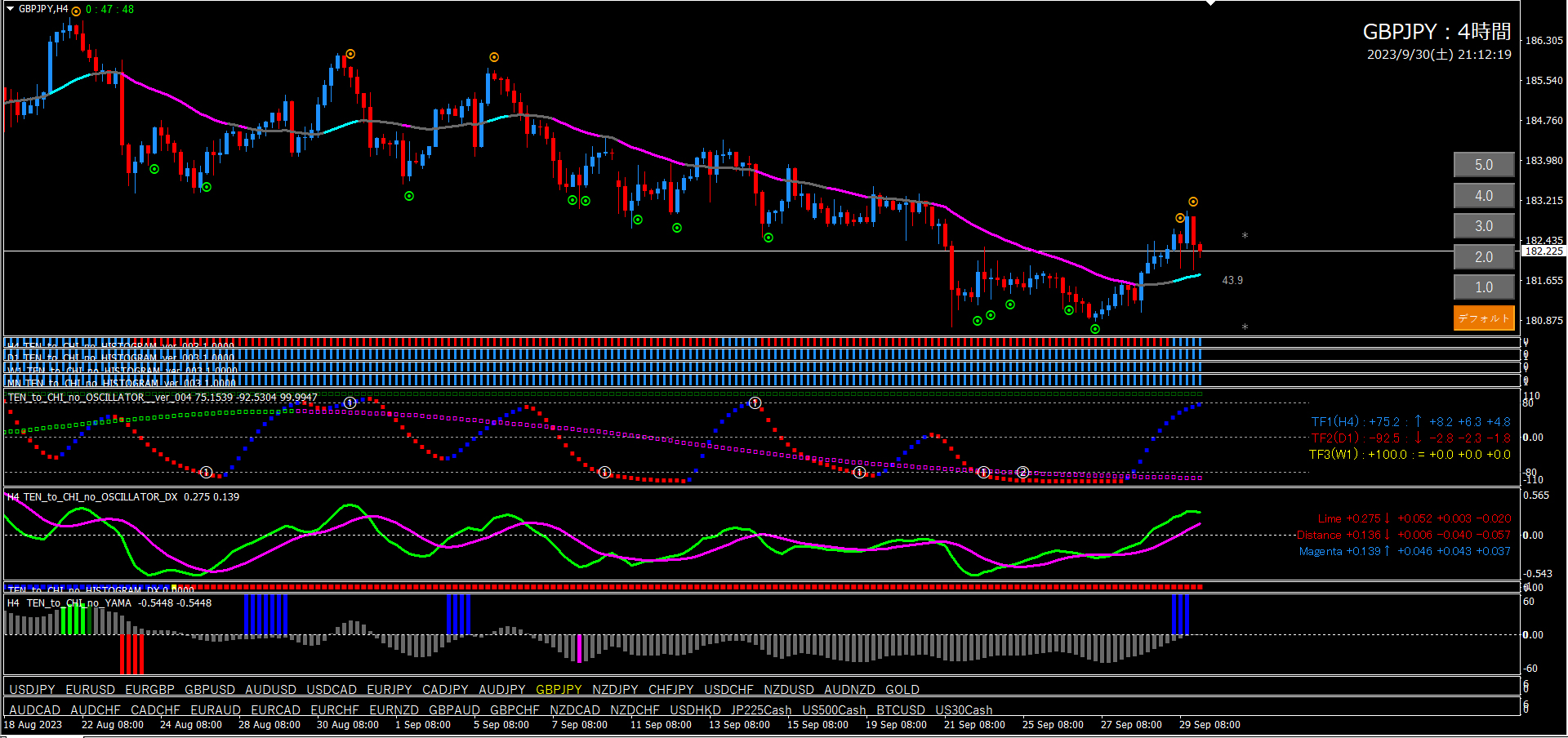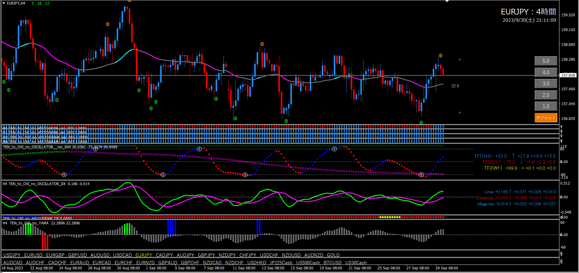 ちょうどショートの点サインが出ています。オシレーターTF2が下降中で、TF1も良い位置にあります。現時点で下目線と判断しても良いですが、ヒストグラムが全青が気になります。オシメーターDXのLimeが↓になるのを確認してからの方が安全です。