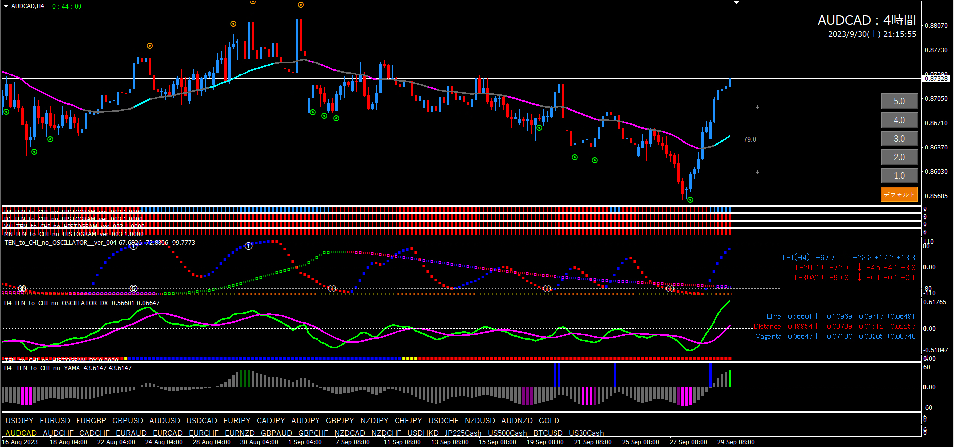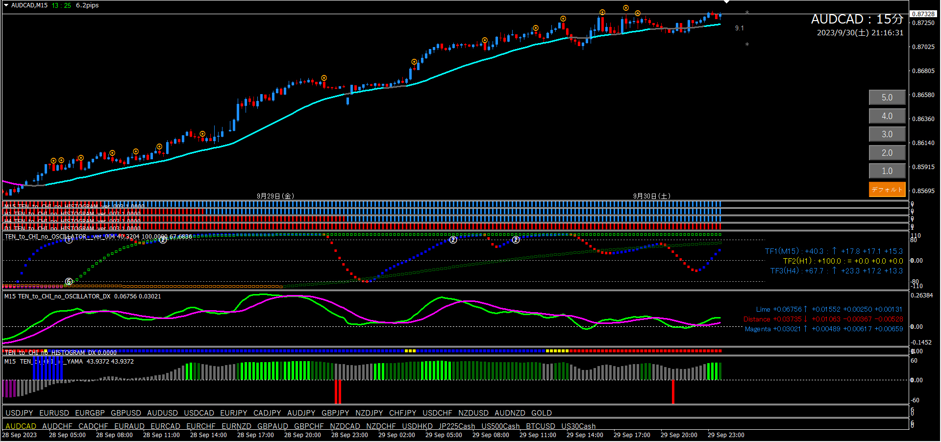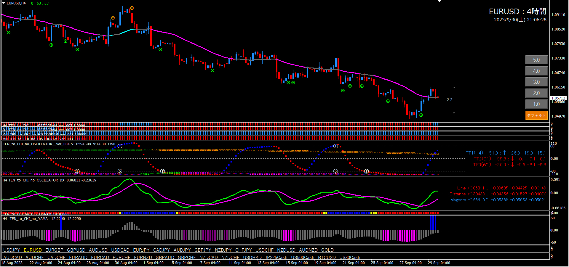 ちょうどショートの点サインが出ています。オシレーターTF2が下降中で、TF1も良い位置にあります。現時点で下目線と判断しても良いですが、ヒストグラムが全青が気になります。オシメーターDXのLimeが↓になるのを確認してからの方が安全です。