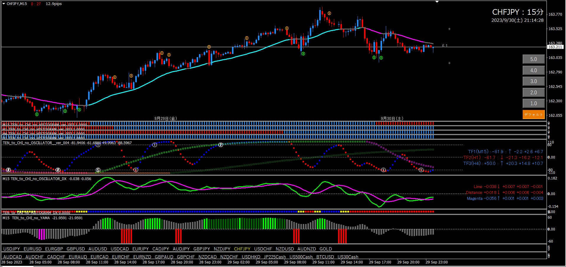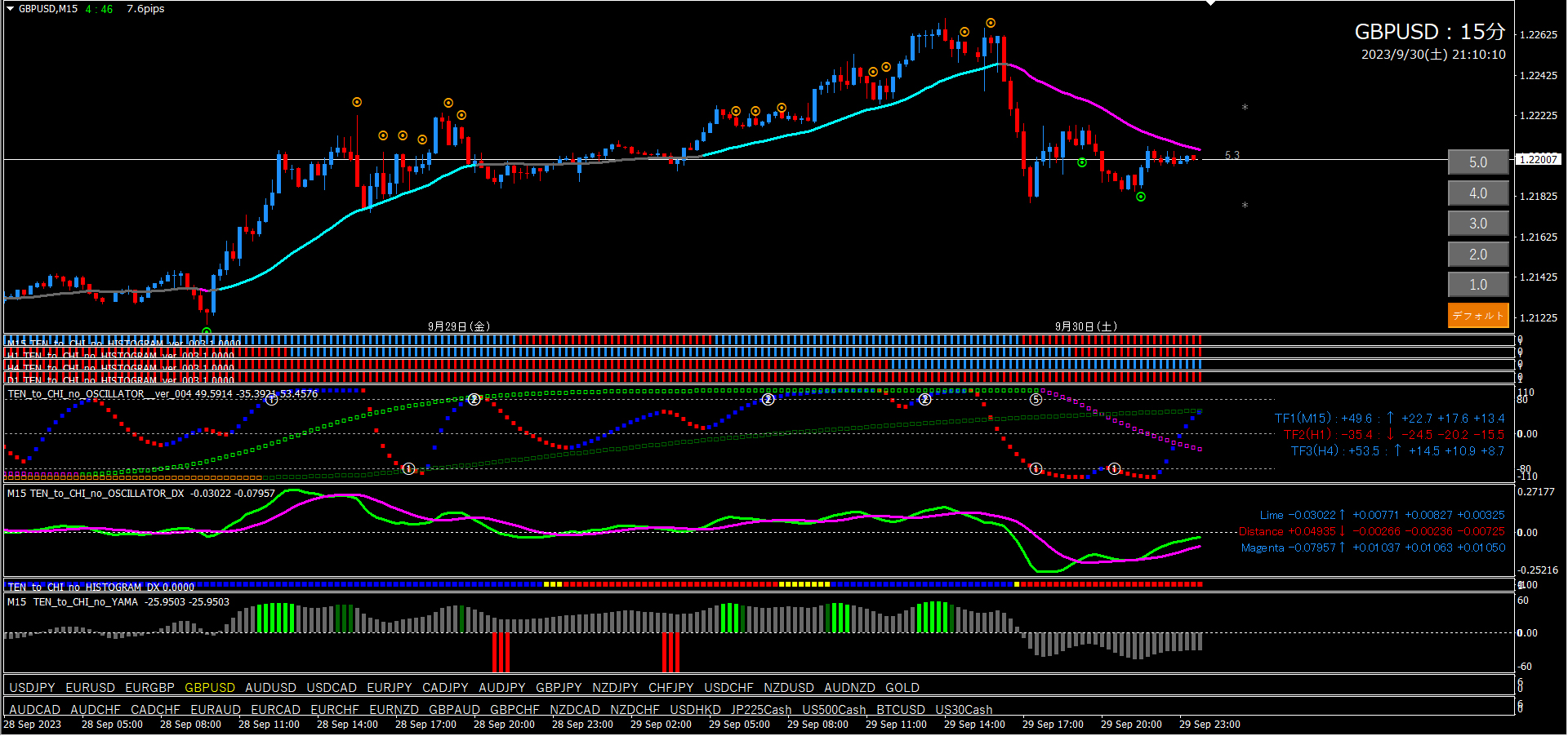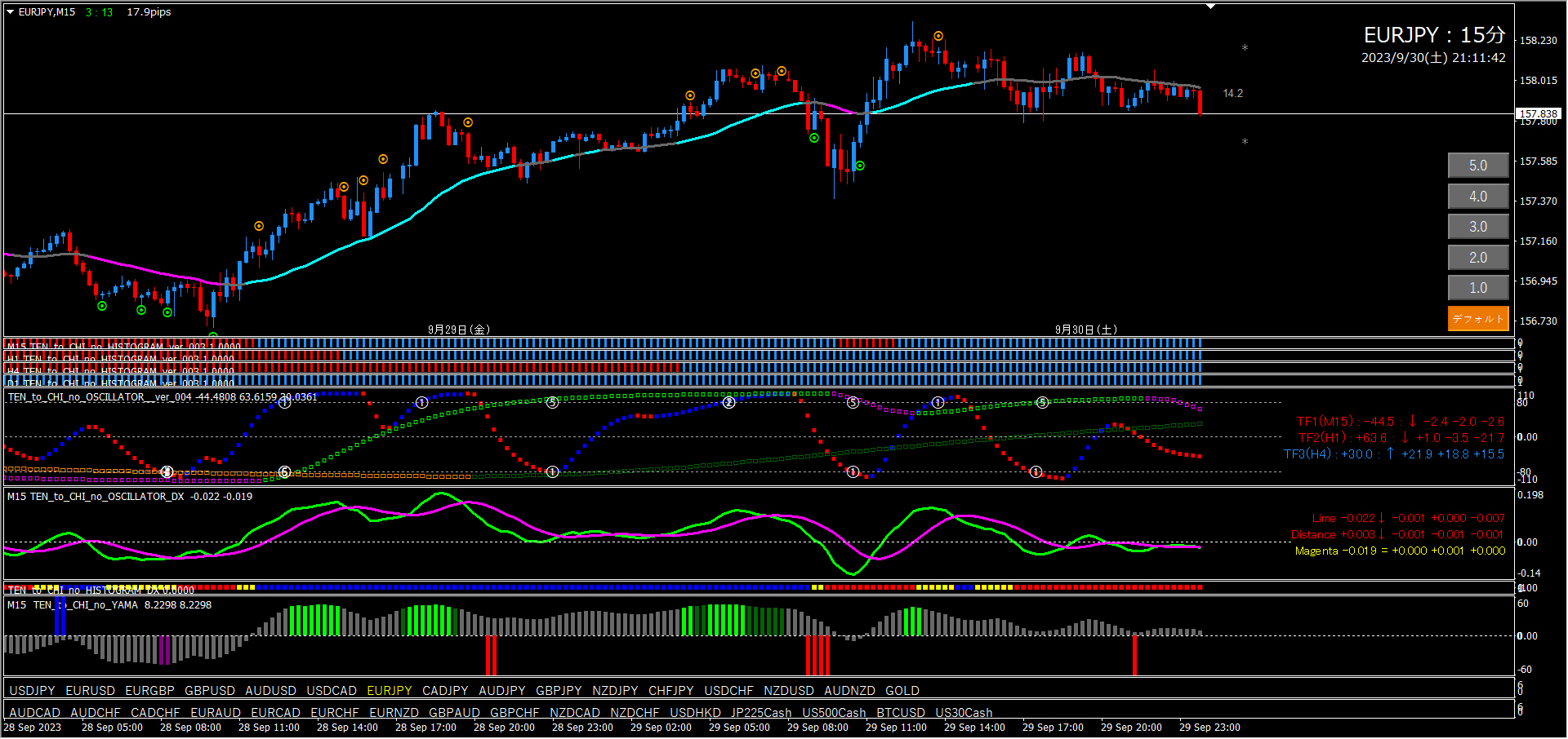 あまり良い形状ではありませんが、オシレーターTF2が既に下降しています。今後のシナリオとしては、TF2が下降中にショート点サインか谷でショートエントリーという流れです。オシレーターDXは収束してしまっているので使えません。4時間足同様に15分足もヒストグラムが全青なので注意が必要です。これが天と地のインジケーターにおけるヒストグラムの使用方法の基本です。注意喚起とトレンド示唆の材料として非常に有効です。