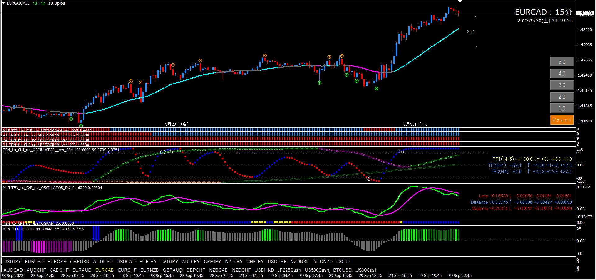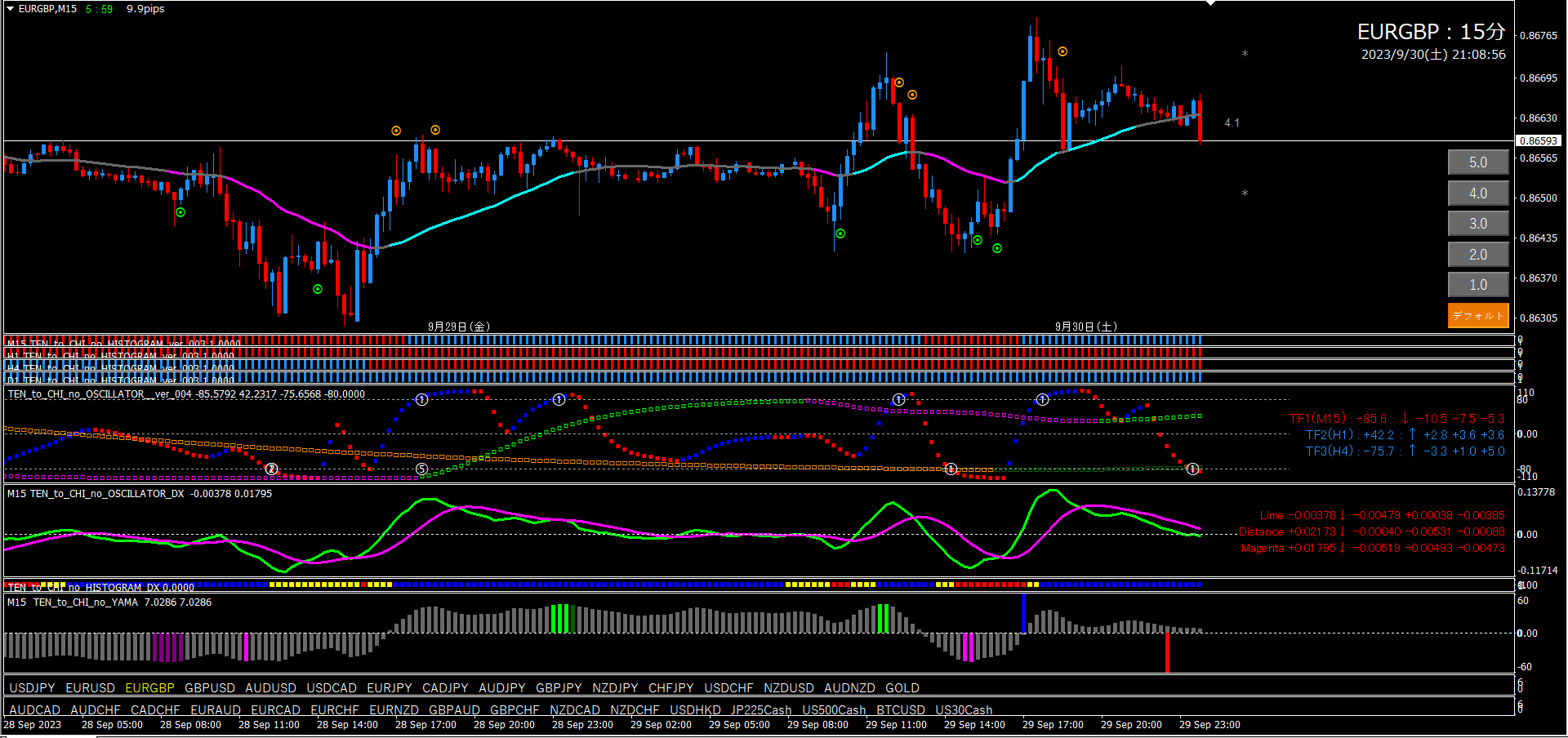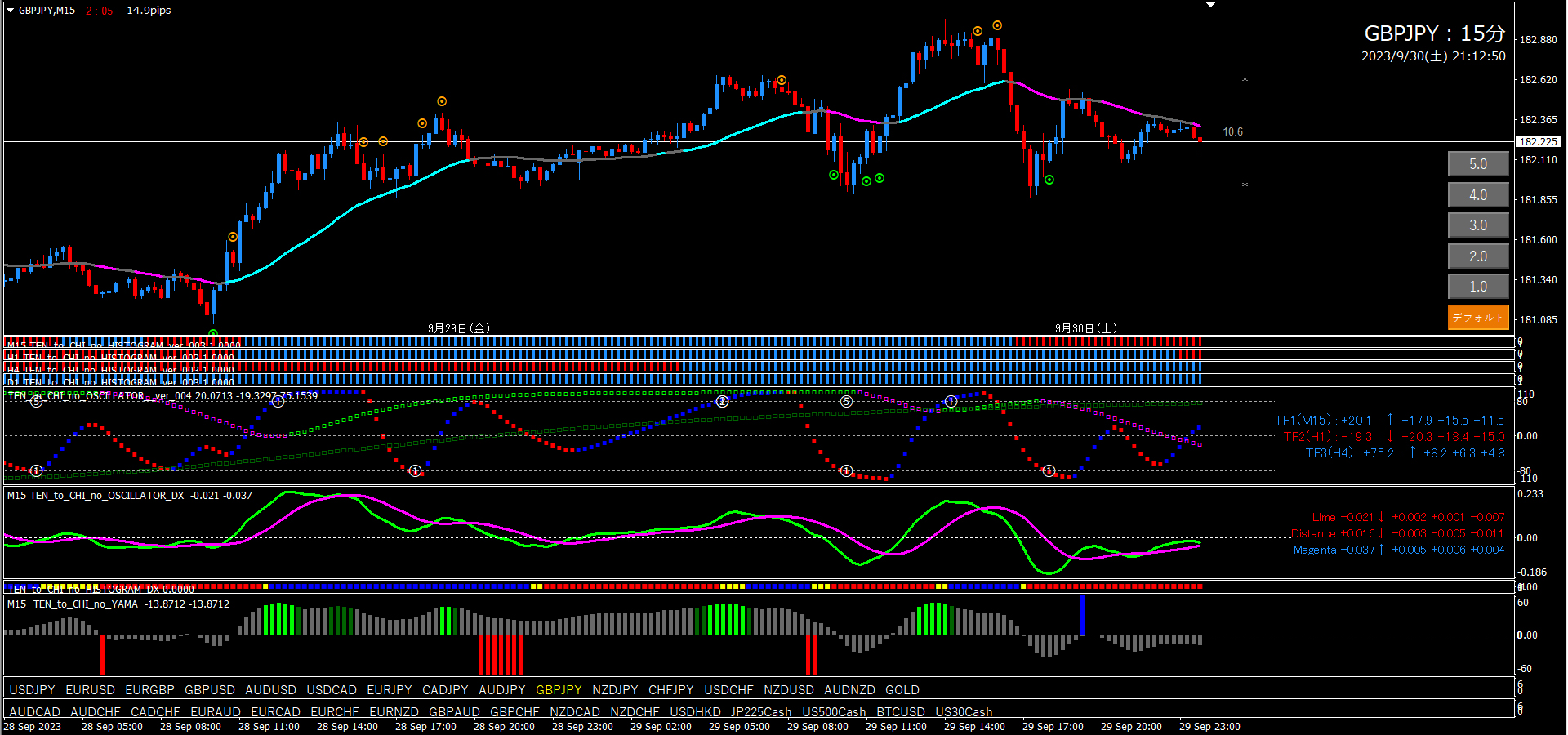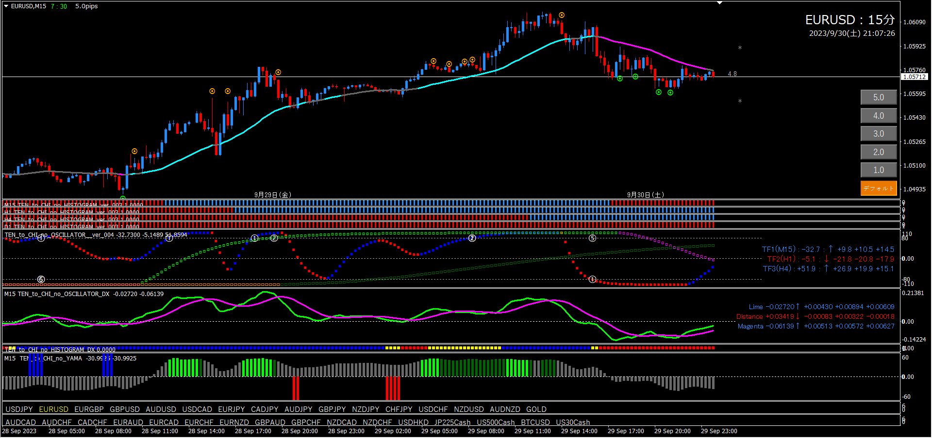 あまり良い形状ではありませんが、オシレーターTF2が既に下降しています。今後のシナリオとしては、TF2が下降中にショート点サインか谷でショートエントリーという流れです。オシレーターDXは収束してしまっているので使えません。4時間足同様に15分足もヒストグラムが全青なので注意が必要です。これが天と地のインジケーターにおけるヒストグラムの使用方法の基本です。注意喚起とトレンド示唆の材料として非常に有効です。