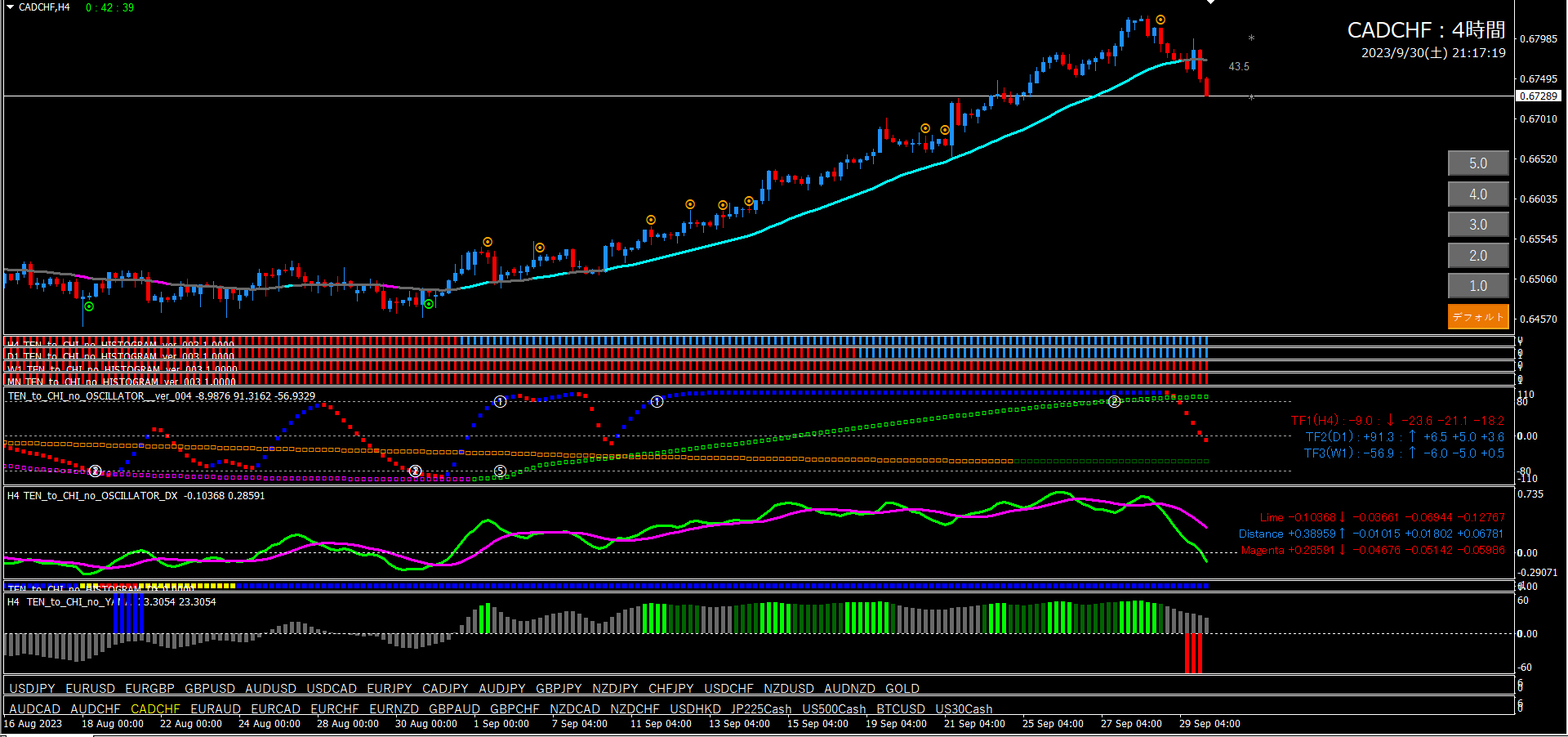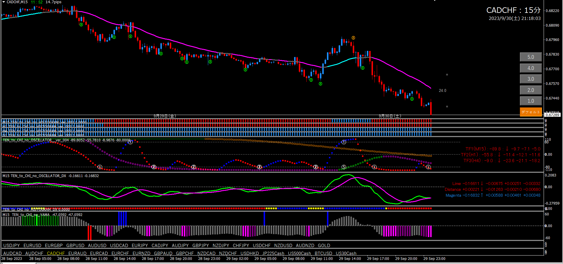 ただしオシレーターDXを見るとまだ上昇の力が続いているので、オシメーターDXがLime↓Distance↓になるのを待ちましょう。ショート点サインもそろそろ出そうです。この2点の根拠で下目線と判断します。ちょうどカナダフランと真逆の形ですね。