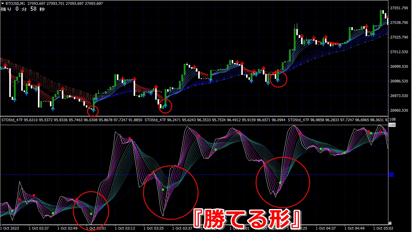 ② 矢印サイン点灯状態で、インジケーターのピンク色の帯が、緑の帯を下からすくい上げるような形状であれば、現在のローソク足が確定する数秒前か確定の直後に1分判定または3分判定でハイエントリーします。