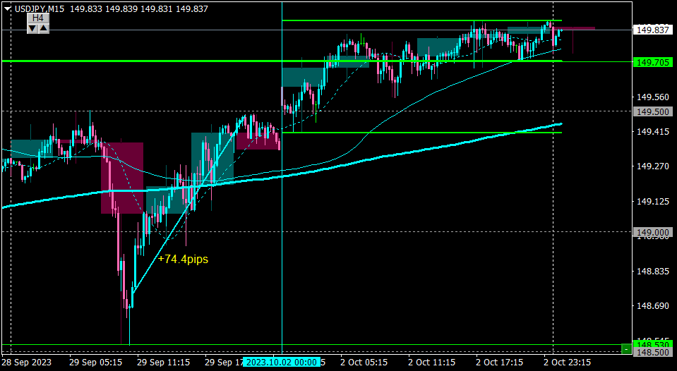〇前日のトレード・USDJPY ドル円(15分足)先週の金曜は、強いと思われたサポート150.50を割り込んできたので、シナリオ変更しショート。ロング勢の損切りも巻き込んで大きく下げた。+71pips