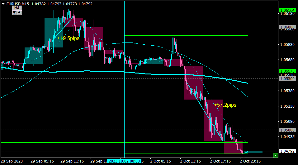 前日安値1.0550で支えられることなく下抜いたのでショートし、H4の足のクローズでイグジット。+57pips
