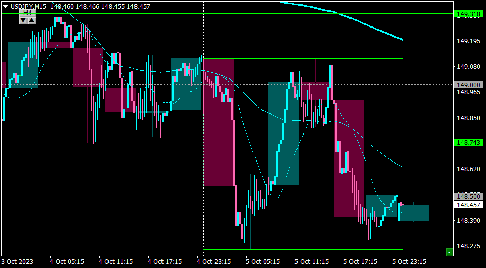 その後148.50でH4の下ヒゲの陽線が出現し強そうなサポートだと判断したので、ショートは見送りノートレード。